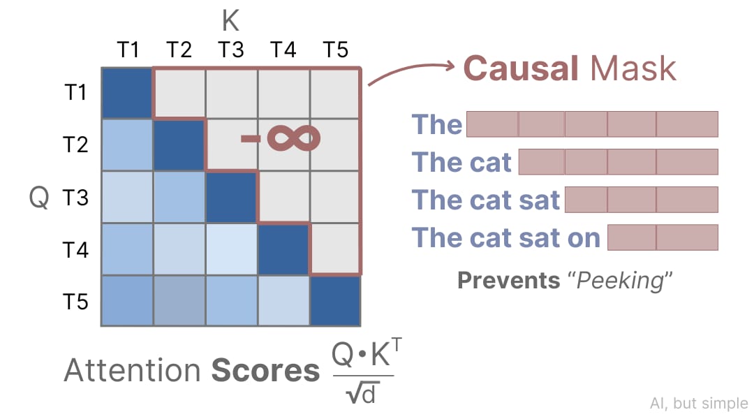 Breaking down attention to its very simplest component, we must understand that attention is calculated for each word/token by providing information about only words/tokens that came before it. This is what’s called the process of causal masking, illustrated below: